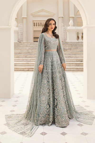 Mehr-o-Mah — Inspired by the sun and the moon, this ethereal bridal ensemble glows with celestial charm. Embellished with golden zari, pearls, and delicate motifs, it embodies harmony, light, and love. Perfect for the bride who shines with grace and radiates divine elegance. ?