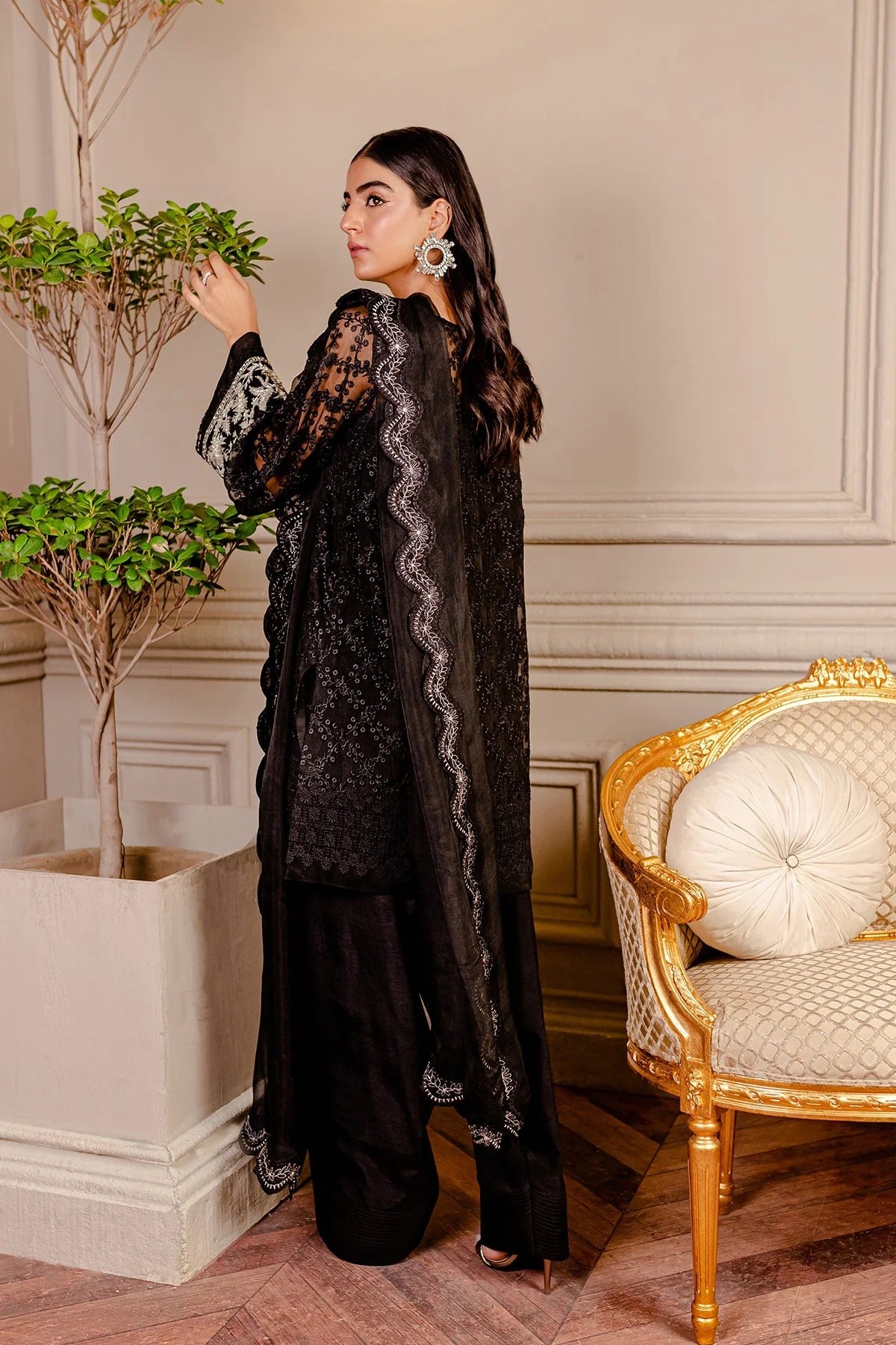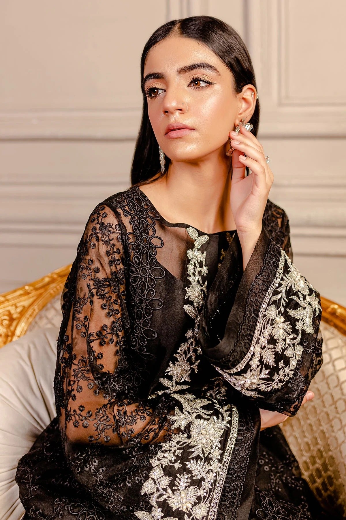 Heavenly embroidered compositions on organza, rendered in black. The neckline and sleeves stand out with contrasting embroidery further enhanced with hand embellishments. The shirt and sleeves are finished with laces. The ensemble’s look is completed with a marvelous organza dupatta with scalloped borders and a Korean Silk salwar.