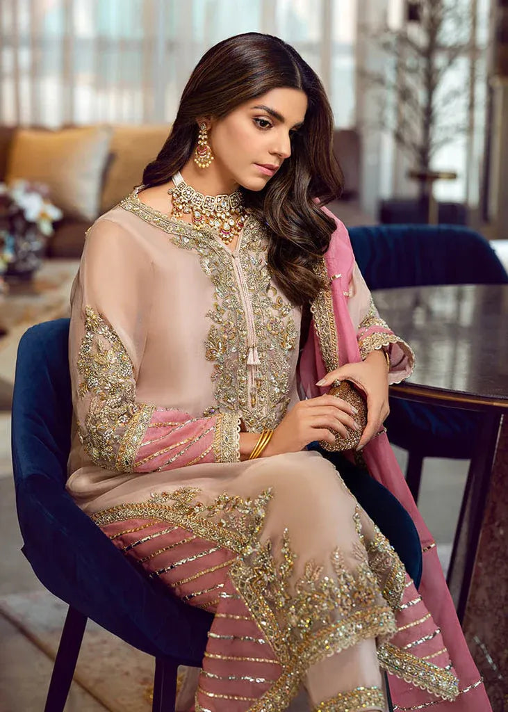 The ensemble is completed with a stunning gold mesuri dupatta, featuring an elegant, intricate pattern that perfectly complements the rich brownish palette of the shirt. This thoughtful combination of colors and textures makes this outfit a striking choice for any special occasion, ensuring you stand out with sophistication and grace.