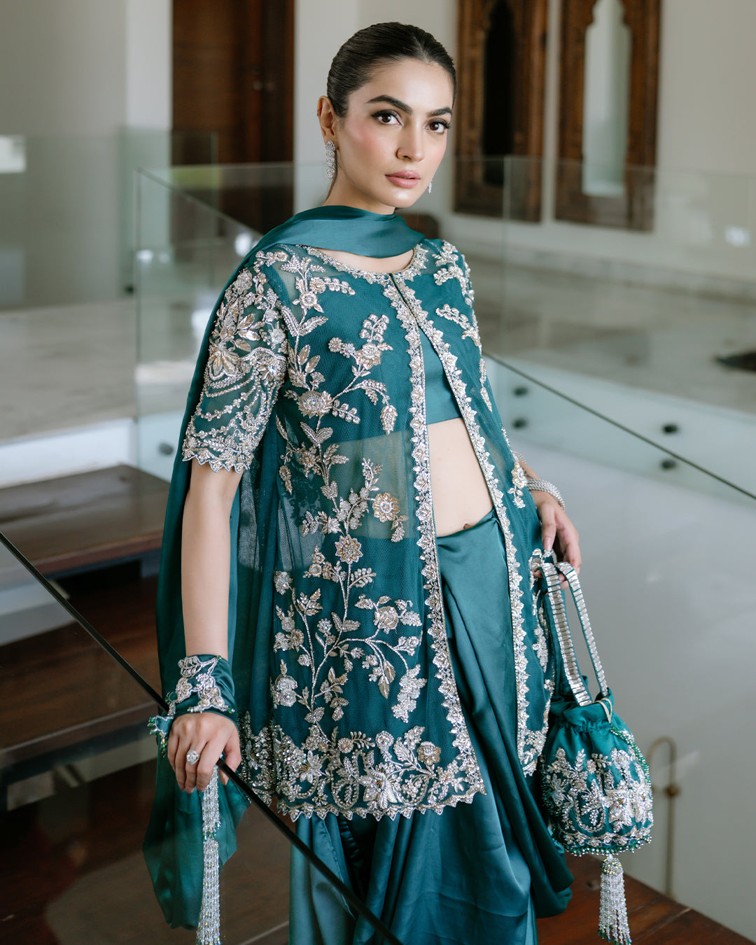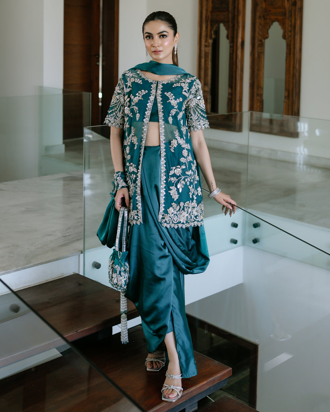 A modern pant-saree paired with an intricately embroidered jacket - elegant, empowered, and effortlessly magnetic.For every woman rewriting what it means to be timeless.